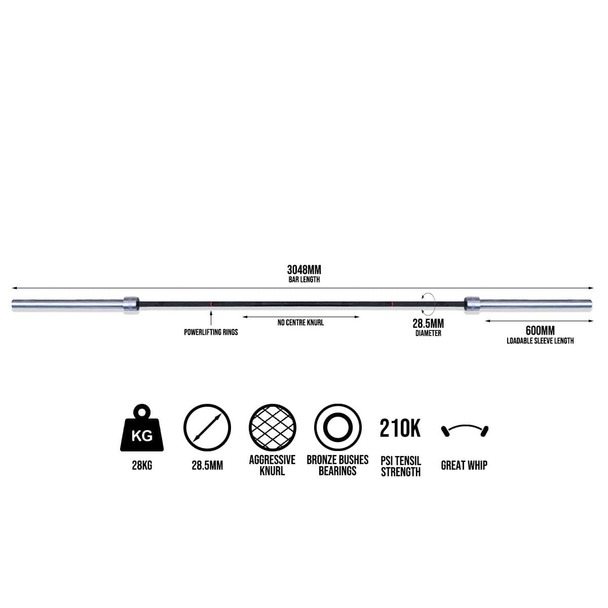 Despite its extreme length this is a durable bar with bronze bushes, zinc shaft and sleeves and has our Cerberus Strength 3-year functional warranty*. It has a massive 600mm loadable sleeve length - this bar is made for big weight! Larger extra-wide collars keep the weight plates even further out to add even more flex and whip. With aggressive knurl, powerlifting markings and no centre knurl.
