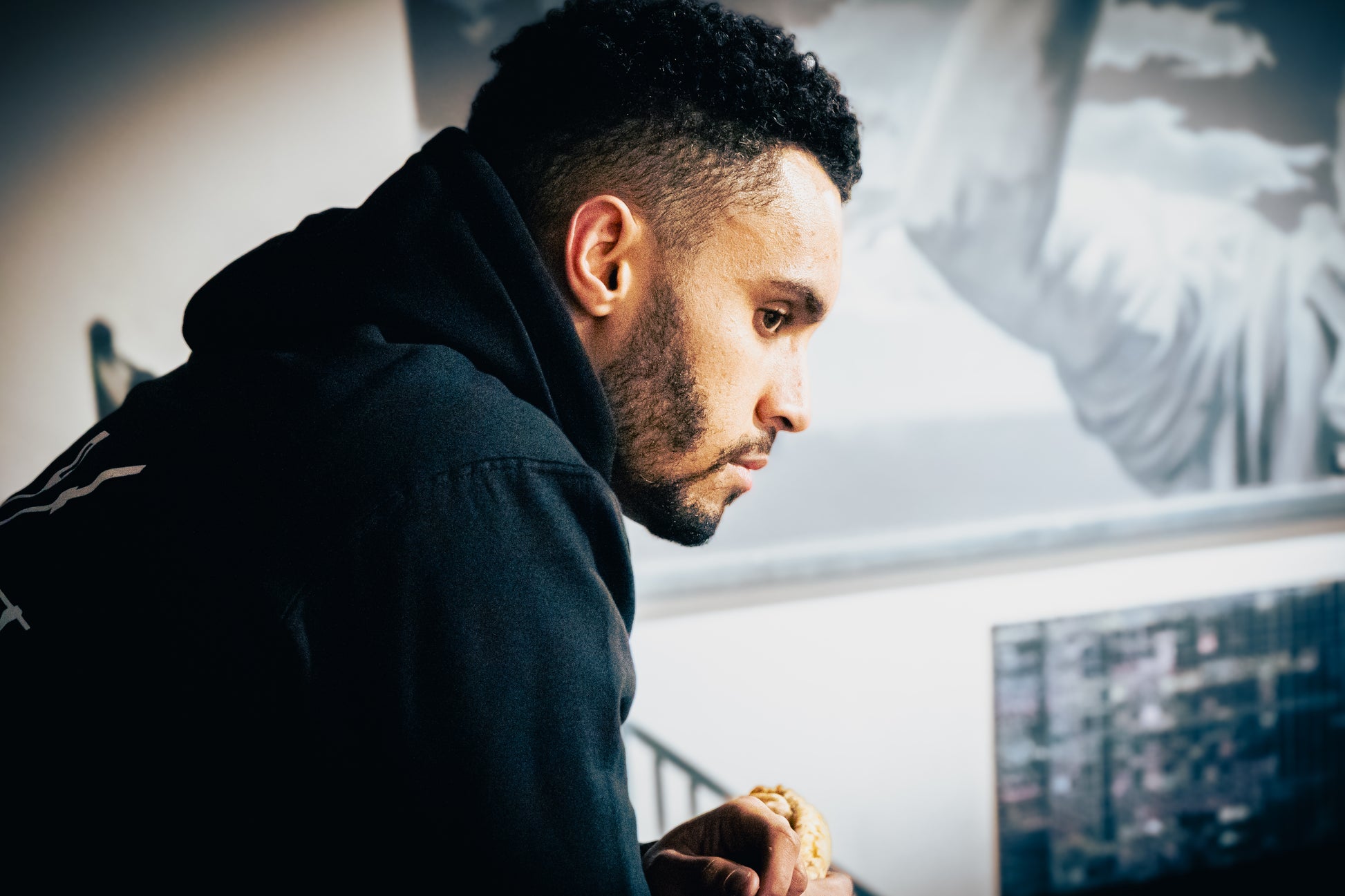 - Black athletic hoodie with white Pasty print on the chest and Barbell logo on the back