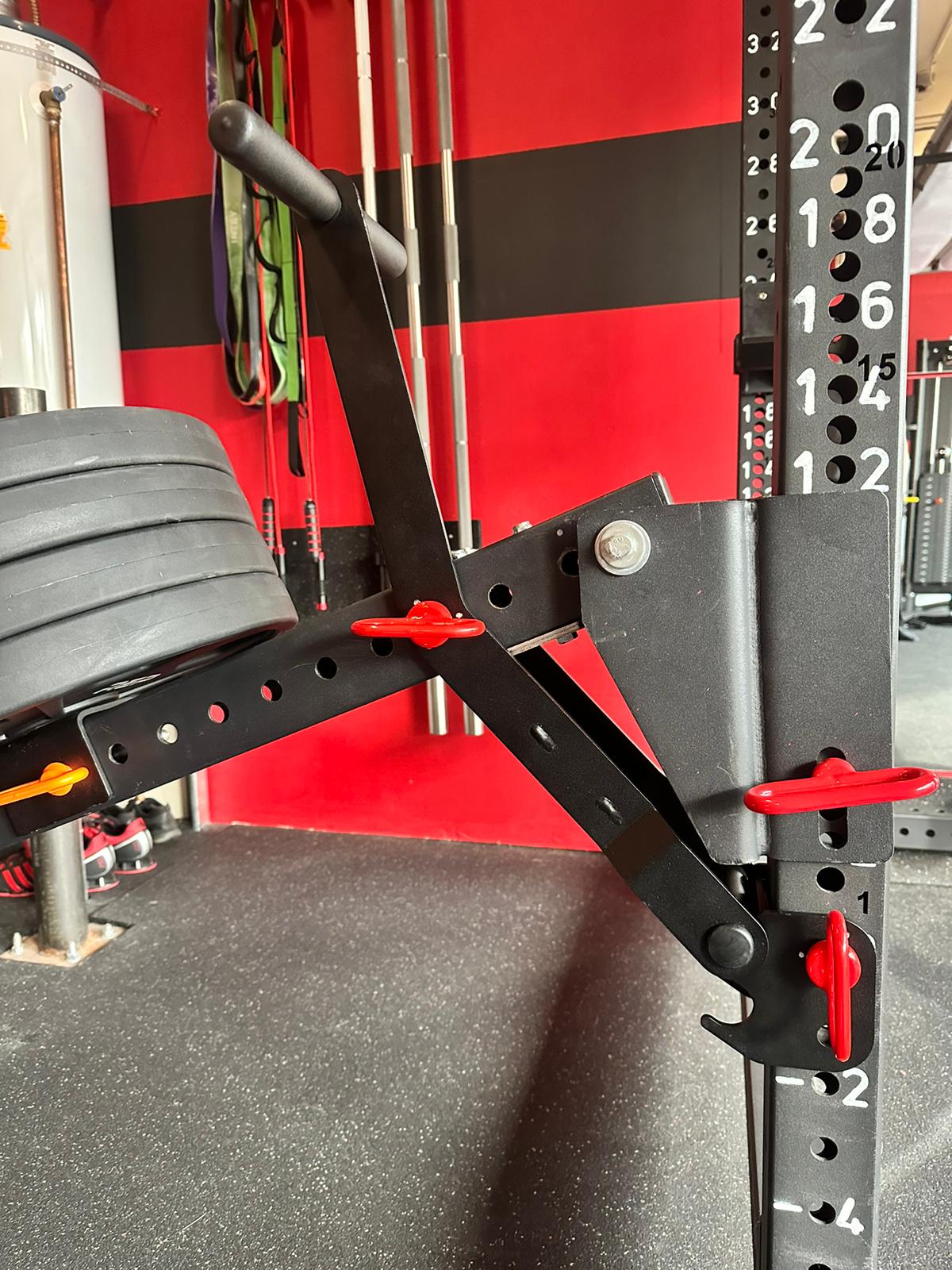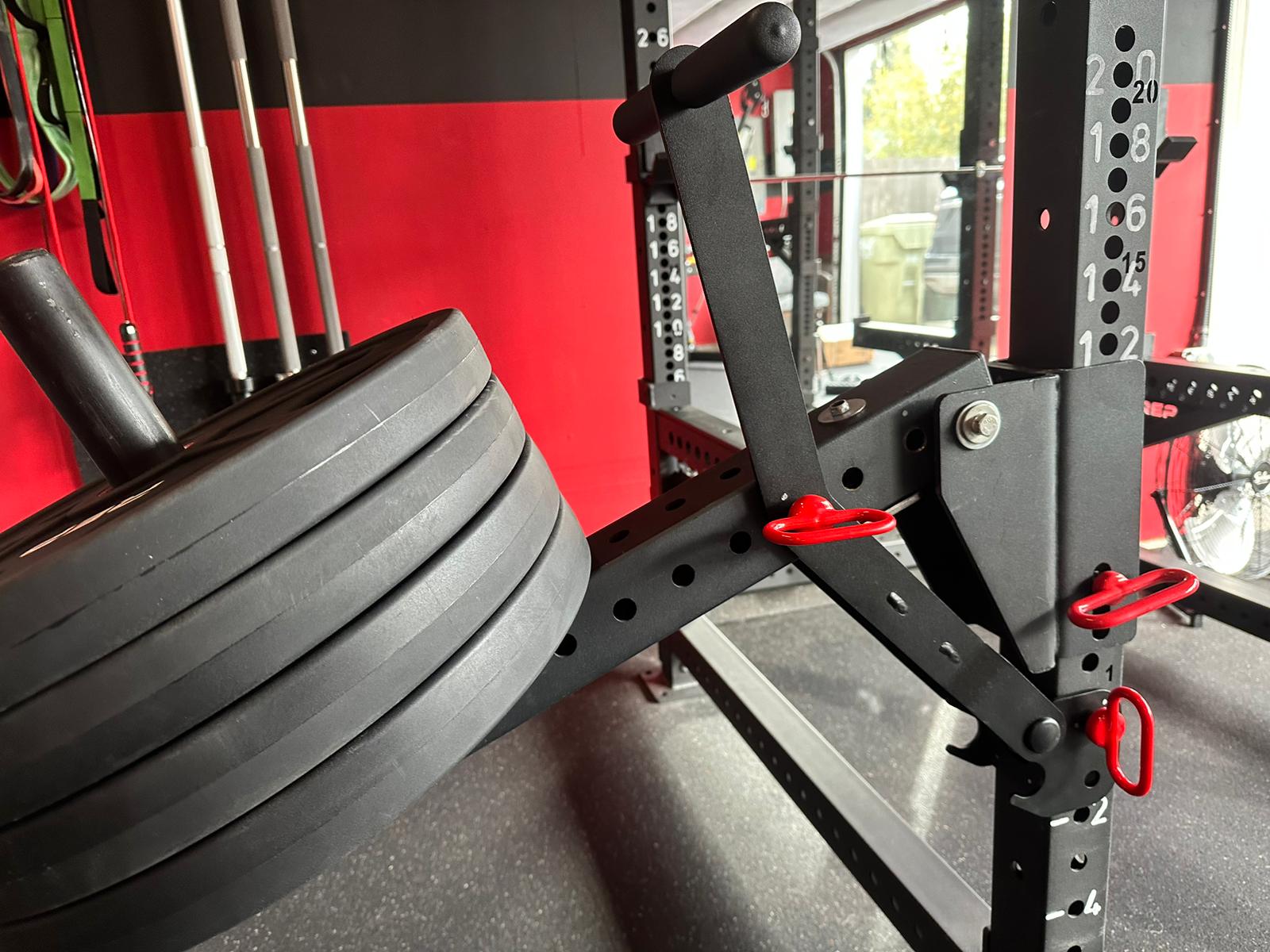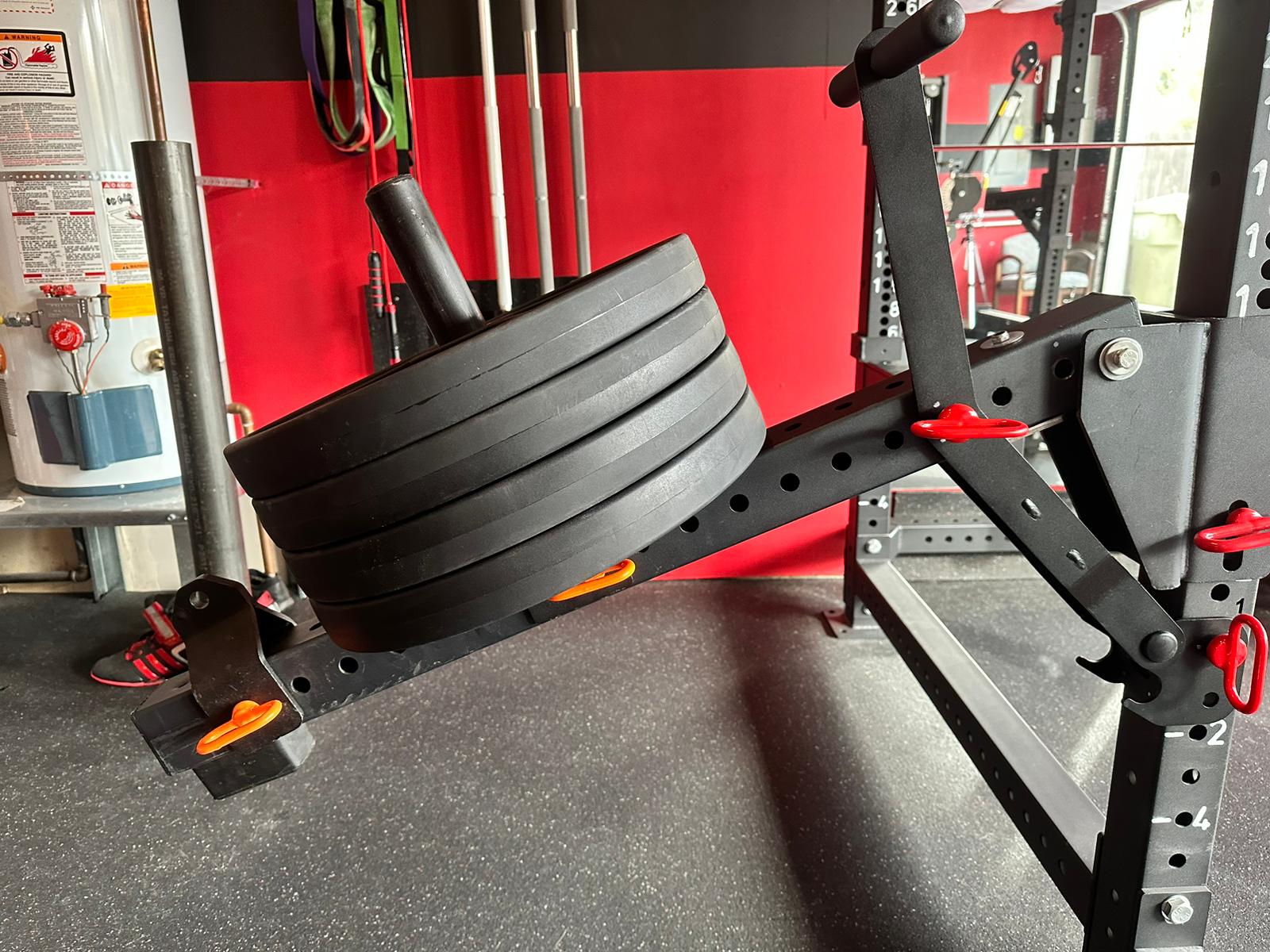 Aaron @CurlsInTheRack (CITR) came up with the kickstand prototype, as a way to get safely in and out of the starting position on lever arm belt squats.